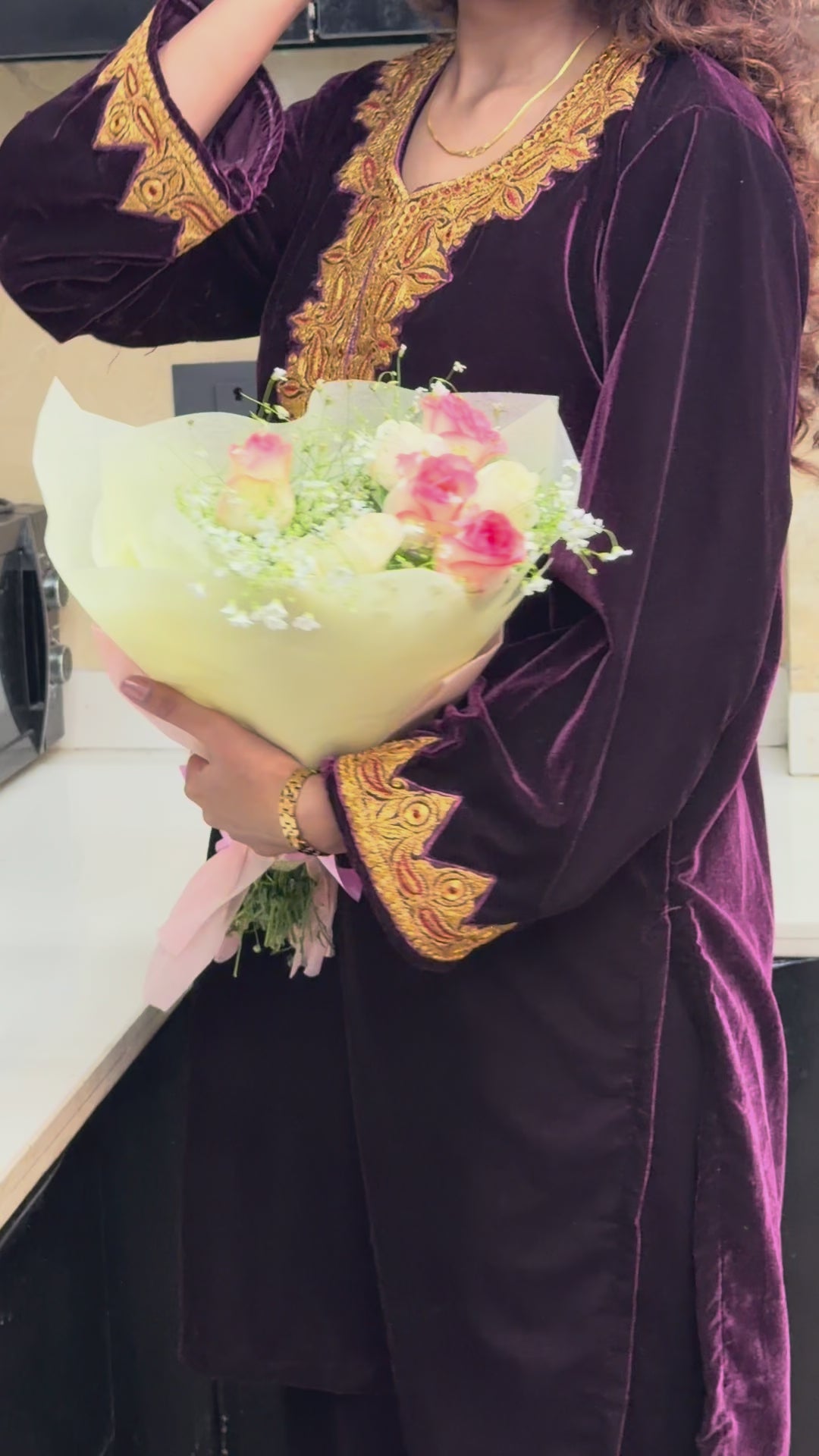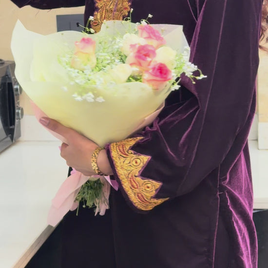 As the evening sun dips low and the first stars begin to shimmer, you slip into the deep, rich feel of the velvet. The tilla work - delicate yet bold — catches the soft glow of lanterns and diyas, turning every thread into a memory. In that moment, you don't just wear a garment - you carry the warmth of handcrafted legacy, the touch of centuries-old artistry, and the quiet luxury of tradition reimagined for today.